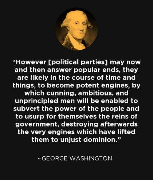 Parties are the death of Republics. Our third president, James Madison proved it with his extraordinary research prior to “fathering” our Constitution. Washington, our first and only independent POTUS, was so enamored with Madison’s research, he copied it in his own hand. His disdain for “factions” was well-known and his Farewell Address to the people said so. Apparently, no one is still listening.