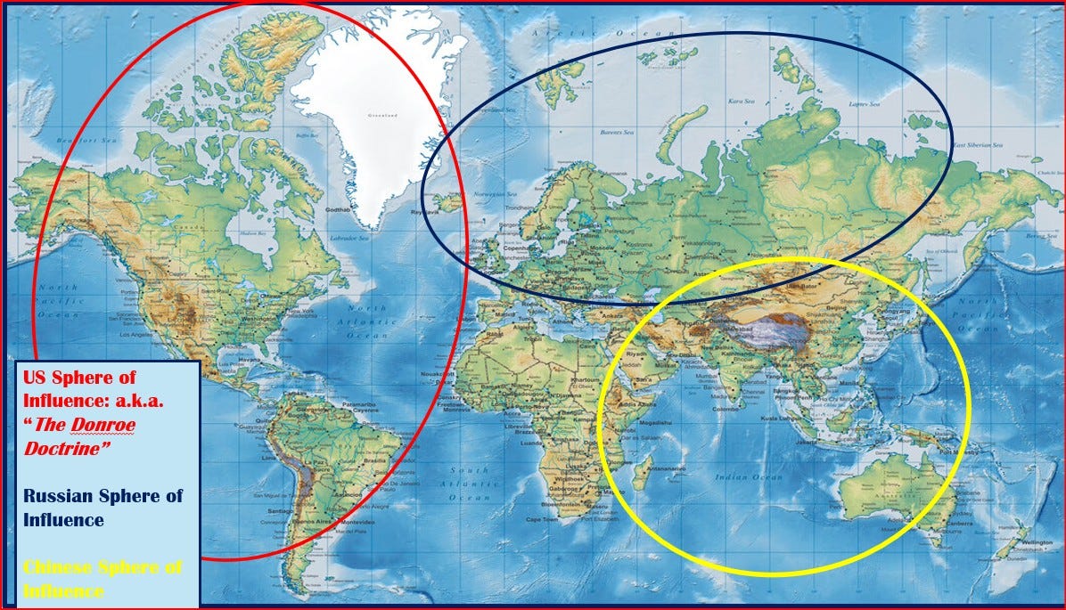 The US, Russian and Chinese triumvirate of power mongering leaders, are carving up the globe into the aforementioned, “spheres of influence,” which are also largely regional in nature. For example, the US in this arrangement dominates everything in the Western Hemisphere, Russia gets Europe including Turkey while that China essentially gets all of Asia plus Iran. At this time, I see Africa still in play between Russia, China and on a lesser scale, India. The only other area with special privileges will likely be the Arab Gulf, oil-states, which will play a role not dissimilar from Switzerland’s traditional “neutrality.”