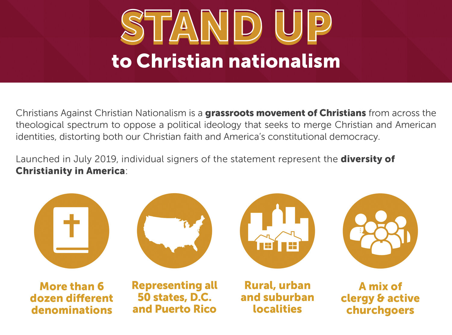 What is Christian Nationalism? Christian nationalism is characterized by the following religious affirmations: - that the United States was founded as a Christian nation - that America is exceptional. - That is, God has given the United States particular blessings and privileges not available to people in other countries, and the nation must remain Christian in order for those blessings to continue - that only Christians are the proper custodians of this nation’s heritage; that Christianity (or a particular form of Christianity) should have privileged status in the United States, particularly in matters of law and political policy - that, even when their presence is tolerated, people who practice other religions or none cannot be fully American — they are not welcomed, their voices are discounted, and they are not to be trusted with political and cultural leadership - that Christians in general and some Christians in particular should enjoy a level of legal protection not granted to those who practice other religions - that Christians have been made to suffer unjustly, leaving them no alternative but to respond with revolutionary zeal to preserve the United States as a great Christian nation. - THE DANGERS OF CHRISTIAN NATIONALISM IN THE UNITED STATES: A POLICY STATEMENT OF THE NATIONAL COUNCIL OF CHURCHES - NCC/ National Council of Churches - 2021