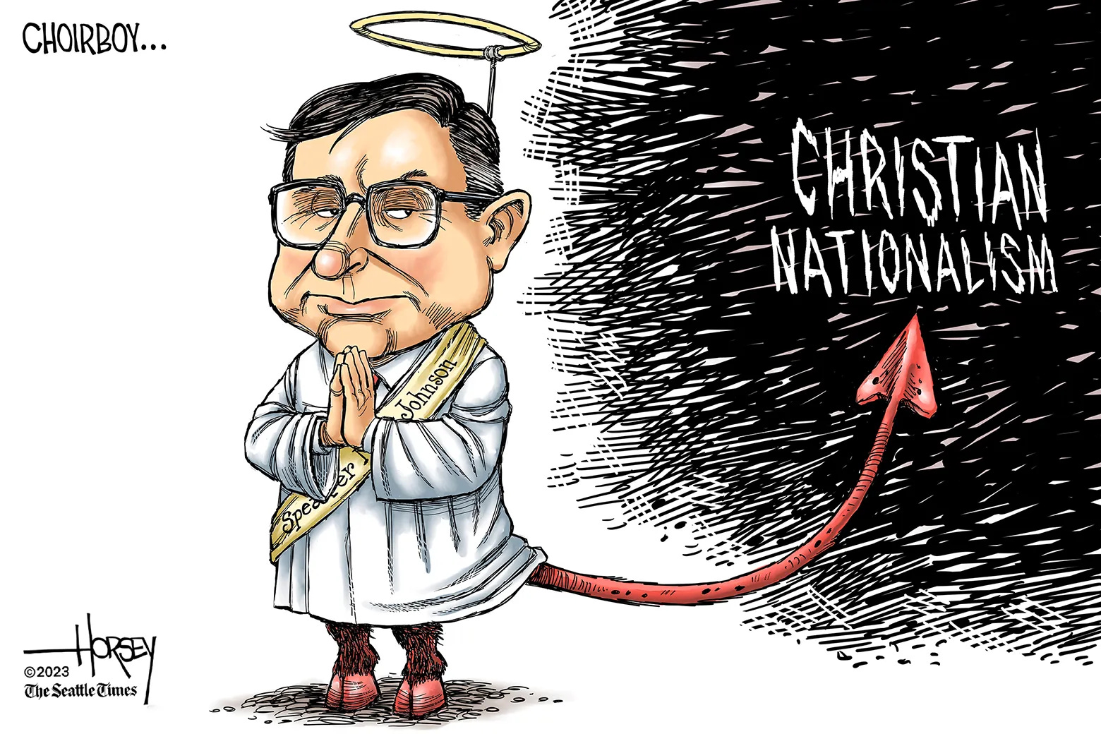 Back to the GOP and more pointedly, the new Speaker of the House, Mike Johnson, a brazen White Christian Nationalist that displays a NAR/ New Apostolic Reformation flag outside of his congressional office. For the record, WCN is the opposite of democracy. It is an authoritarian, xenophobic and racist theology. Since 2015, the GOP has become almost exclusively, WCN and a threat to American democracy. This perspective still controls the party and more pointedly, it underpins the Trump era, party dedication to supporting Putin, not US national security.