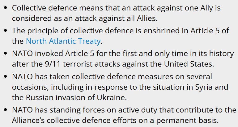 At the heart of NATO is Article 5, which speaks to the principle of collective defense. In other words, any attack on any NATO nation demands the response of all NATO Treaty nations. It has been the single most effective treaty that kept the Soviets and today’s Russia at bay, throughout the Cold War and until today. Whether under the Tsars and Imperial Russia or the Soviet Union, conquest has always been part of the plan, to include global domination.