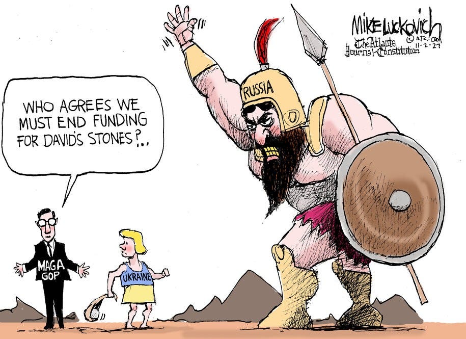 Enter now, today’s MAGA controlled GOP who consistently strives to defund Ukraine’s resistance to genocide, while concurrently exposing NATO’s Eastern flank to invasion, another massive war across Europe, and maybe the world. Here I must be blunt, if we do not continue to invest in our fellow democracy in Ukraine and their fighting and dying, we will again be at war, doing it ourselves. The Ukrainian people are not only fighting to save their lives and culture, but they are defending the Western world, against the now expanding bloc of nations, hellbent on global conquest and headed by China.