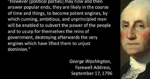 Please see this quote from Washington's Farewell address and ponder its powerful words. I have already intimated to you the danger of parties in the State, with particular reference to the founding of them on geographical discriminations. Let me now take a more comprehensive view, and warn you in the most solemn manner against the baneful effects of the spirit of party generally. This spirit, unfortunately, is inseparable from our nature, having its root in the strongest passions of the human mind. It exists under different shapes in all governments, more or less stifled, controlled, or repressed; but, in those of the popular form, it is seen in its greatest rankness, and is truly their worst enemy. The alternate domination of one faction over another, sharpened by the spirit of revenge, natural to party dissension, which in different ages and countries has perpetrated the most horrid enormities, is itself a frightful despotism. But this leads at length to a more formal and permanent despotism. The disorders and miseries which result gradually incline the minds of men to seek security and repose in the absolute power of an individual; and sooner or later the chief of some prevailing faction, more able or more fortunate than his competitors, turns this disposition to the purposes of his own elevation, on the ruins of public liberty. Without looking forward to an extremity of this kind (which nevertheless ought not to be entirely out of sight), the common and continual mischiefs of the spirit of party are sufficient to make it the interest and duty of a wise people to discourage and restrain it. It serves always to distract the public councils and enfeeble the public administration. It agitates the community with ill-founded jealousies and false alarms, kindles the animosity of one part against another, foments occasionally riot and insurrection. It opens the door to foreign influence and corruption, which finds a facilitated access to the government itself through the channels of party passions. Thus the policy and the will of one country are subjected to the policy and will of another. . . . Against the insidious wiles of foreign influence (I conjure you to believe me, fellow-citizens) the jealousy of a free people ought to be constantly awake, since history and experience prove that foreign influence is one of the most baneful foes of republican government. But that jealousy to be useful must be impartial; else it becomes the instrument of the very influence to be avoided, instead of a defense against it. Excessive partiality for one foreign nation and excessive dislike of another cause those whom they actuate to see danger only on one side, and serve to veil and even second the arts of influence on the other. Real patriots who may resist the intrigues of the favorite are liable to become suspected and odious, while its tools and dupes usurp the applause and confidence of the people, to surrender their interests. - Washington's Farewell Address- Constitution Center.org - President George Washington - 17 September, 1796