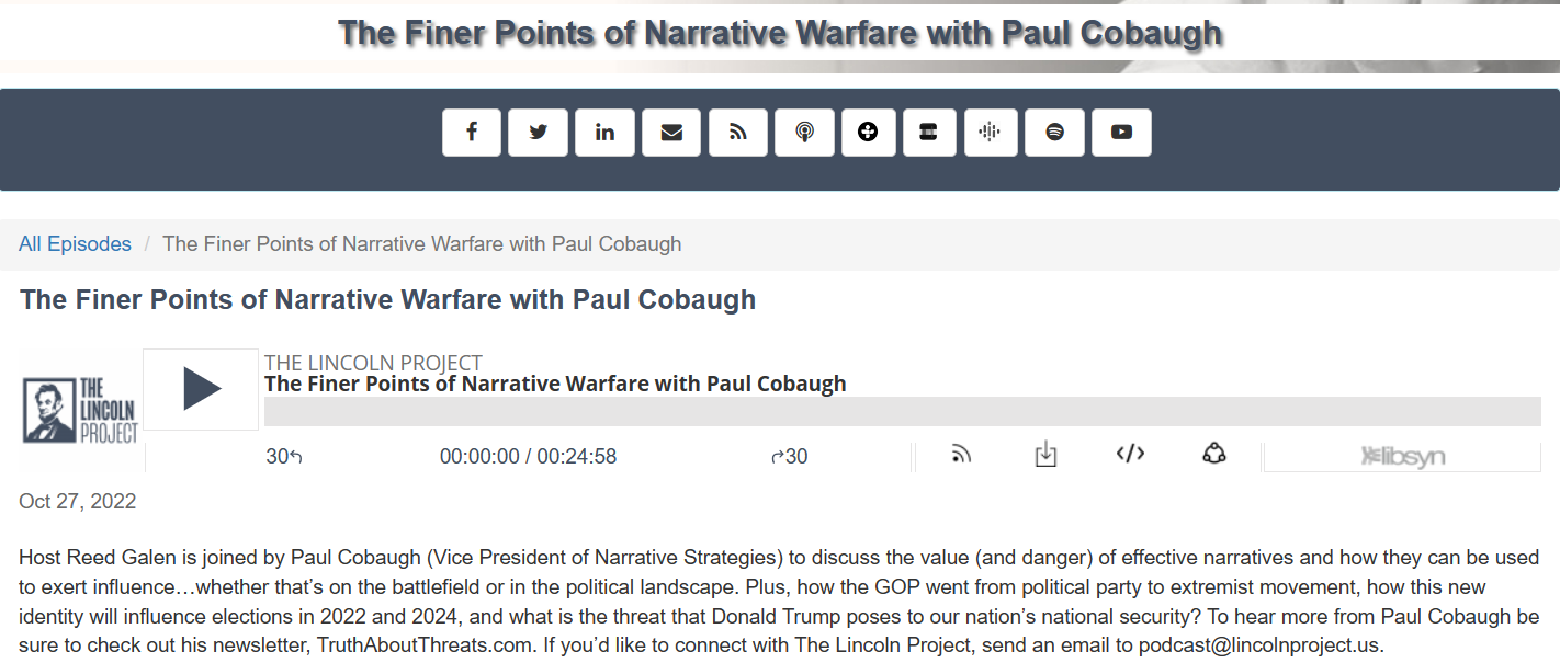 This has everything to do with my expertise in Narrative Warfare. It has nothing to do with my political beliefs. If you see today’s article as political in nature, it may have more to do with your own political identity, rather than the acute threat that MAGA is to our nation. For a fuller understanding of Narrative Warfare and today’s Republican Party, I include the following link to my “Lincoln Project” podcast interview, just prior to the 2022 election.
