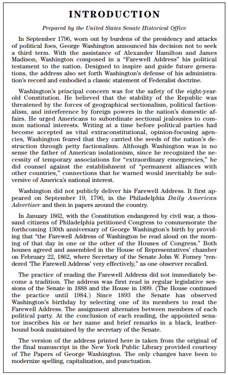 I will conclude today’s article with the following introduction to Washington’s Farewell Address, regarding factions. They are ominous.